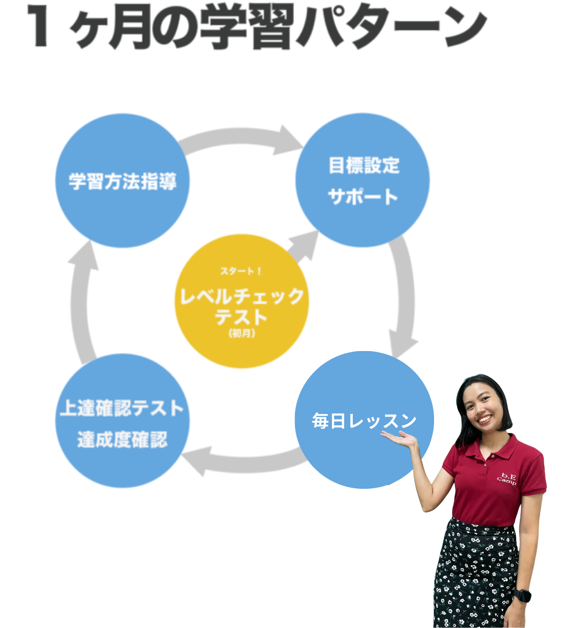 BECの講師は、合格率わずか5%という採用試験と厳しいトレーニングをパスした正規採用社員です。また、生徒様に満足度の高い授業を提供し続けていく為、常に改善活動を続けています。全ての生徒様に安心して授業を受けていただいています。